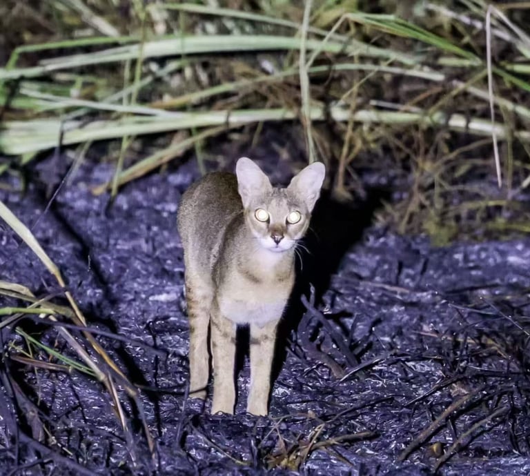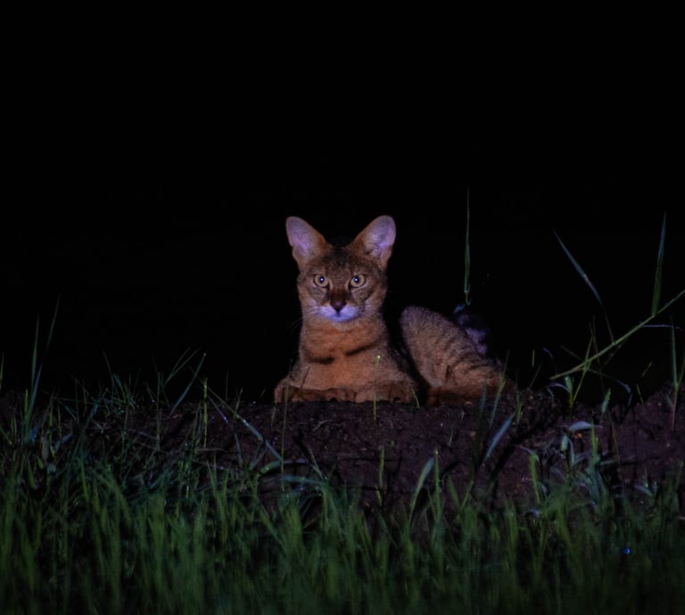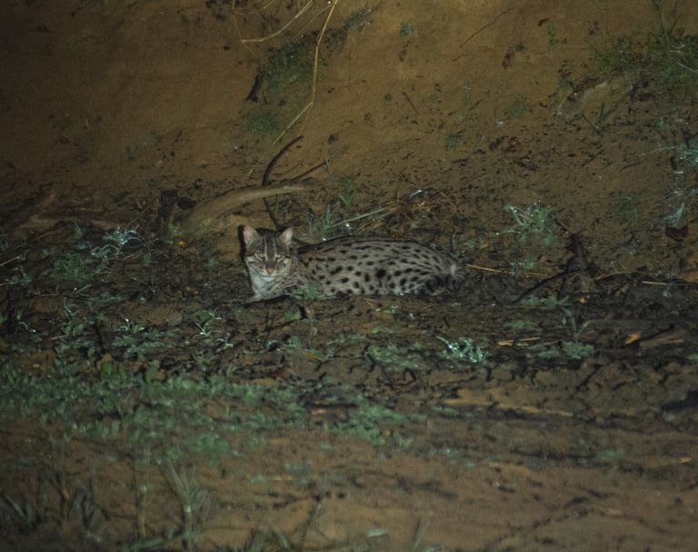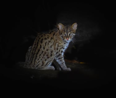 As twilight fades, step into a different world. Nightfall brings the jungle alive, revealing a cast of elusive and fascinating creatures. For example, wild elephants may be seen silently grazing beneath the stars. You might also spot the secretive Fishing Cat (Prionailurus viverrinus – හදුන් දිවියා) stalking along the water’s edge.